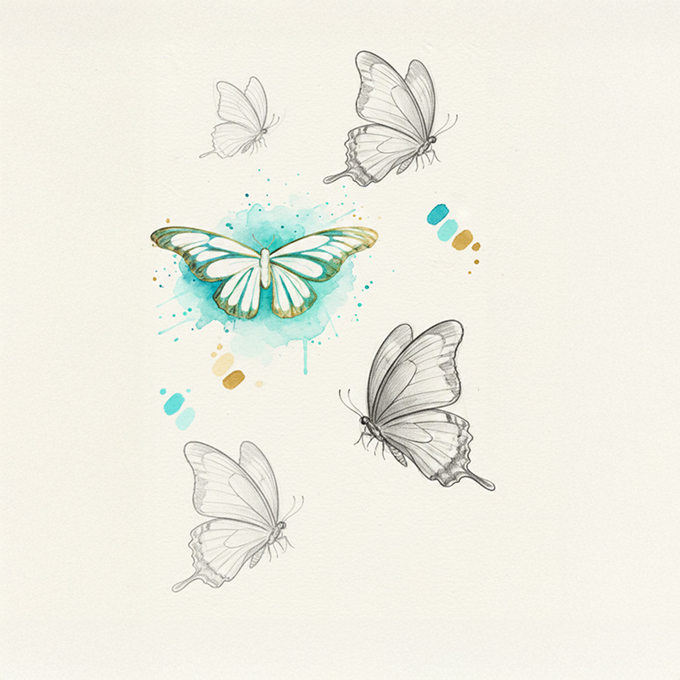 Entry Level: Clean typography combined with a watercolor butterfly illustration that brings freshness, lightness, and differentiation. The soft color palette (blues and greens) reinforces the organic message without falling into the typical golds and reds of traditional labels.